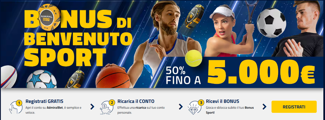 Per gli appassionati di scommesse sportive, Admiralbet.it propone un real bonus specifico del 50% fino a 1.000€. Questo bonus è perfetto per chi ama scommettere sugli eventi sportivi, dalla Serie A ai tornei internazionali. Avere un bonus disponibile permette di testare diverse strategie di scommessa senza esporsi troppo finanziariamente.