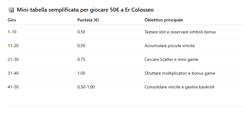 Ecco una strategia completa per giocare alla slot Er Colosseo con 50€, con una tabella dettagliata dei giri, consigli pratici sui bonus e sul mini-game Gladiatore, e suggerimenti per gestire il bankroll in modo responsabile.