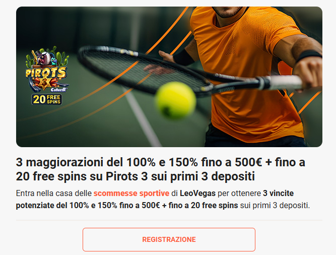 Oltre al vantaggioso bonus sulle scommesse sportive, LeoVegas.it offre anche fino a 20 free spins su Pirots 3. Questo gioco di slot è una delle attrazioni principali del casinò online, grazie alla sua grafica accattivante e al gameplay avvincente. Gli spin gratuiti ti danno l'opportunità di esplorare il gioco senza rischiare i tuoi fondi, con la possibilità di vincere premi interessanti.