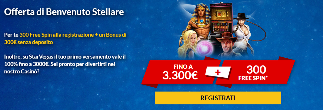 StarVegas.it dà il benvenuto ai nuovi iscritti con un regalo che non si vede tutti i giorni: 300 giri gratis! Ma c’è di più, riceverete anche 300€ senza dover depositare un centesimo. Questa doppia offerta è perfetta per chi vuole esplorare il mondo del casinò online senza mettere subito mano al portafoglio.
